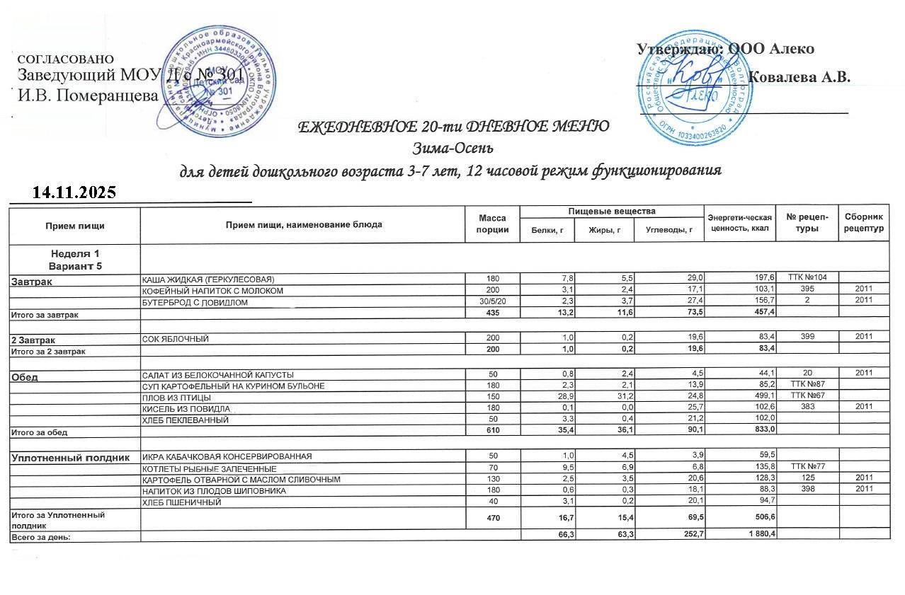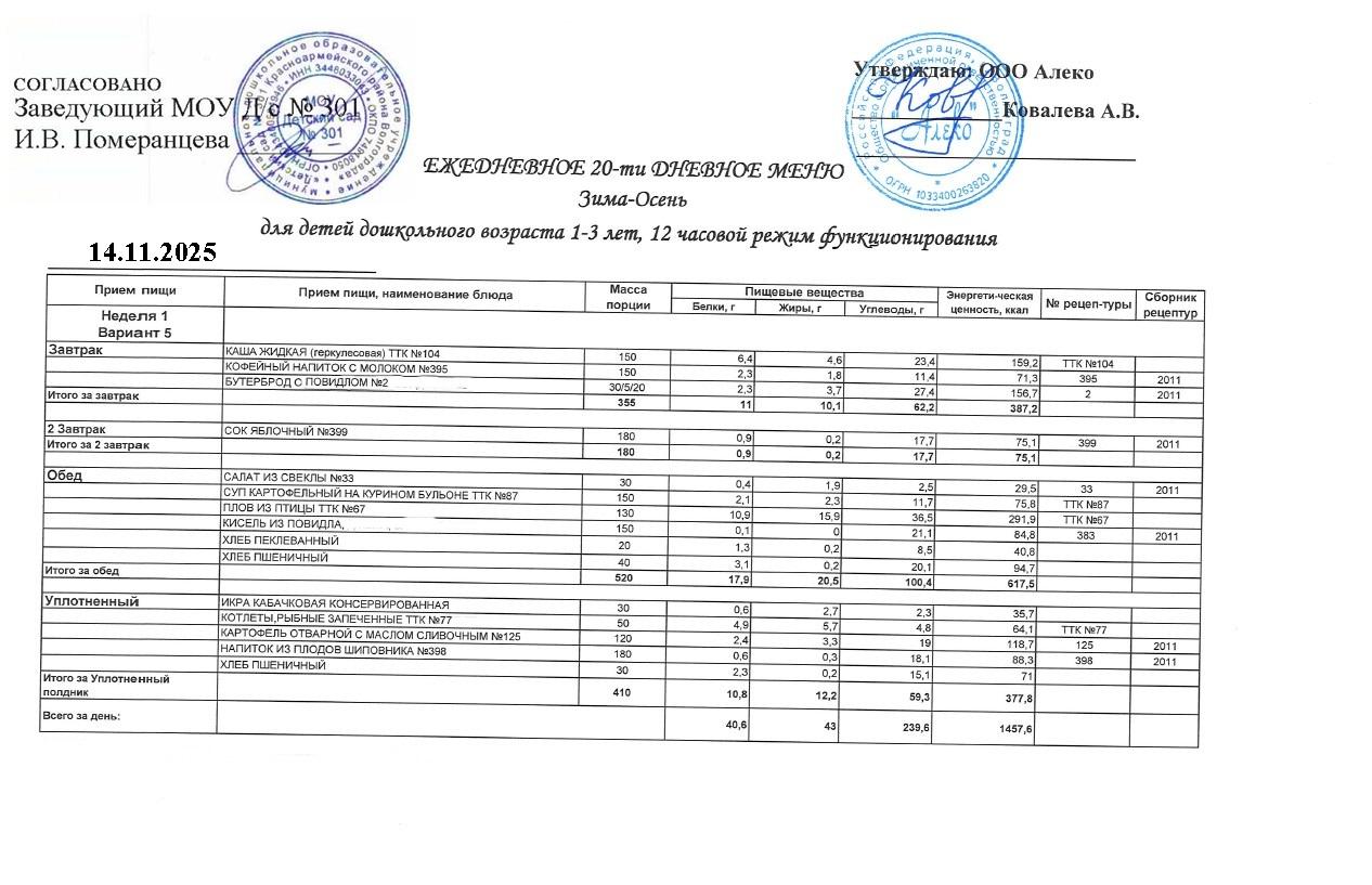 ПИТАНИЕ СЕГОДНЯ Меню для детей раннего возраста 1-3 лет и для детей дошкольного возраста 3-7 лет на 14.11.2025