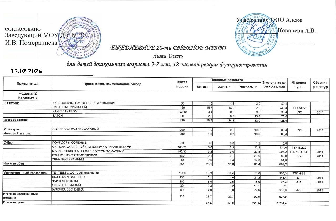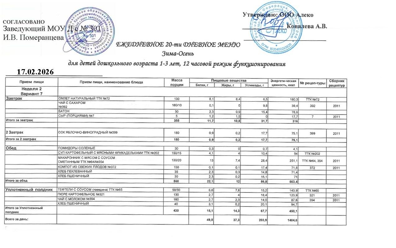 Меню для детей раннего возраста 1-3 лет и для детей дошкольного возраста 3-7 лет на 17.02.2026