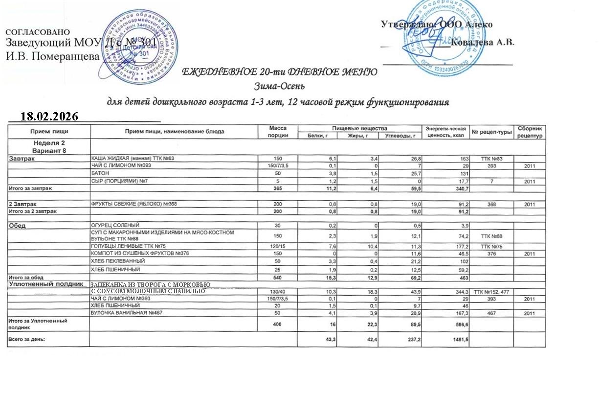 Меню для детей раннего возраста 1-3 лет и для детей дошкольного возраста 3-7 лет на 18.02.2026