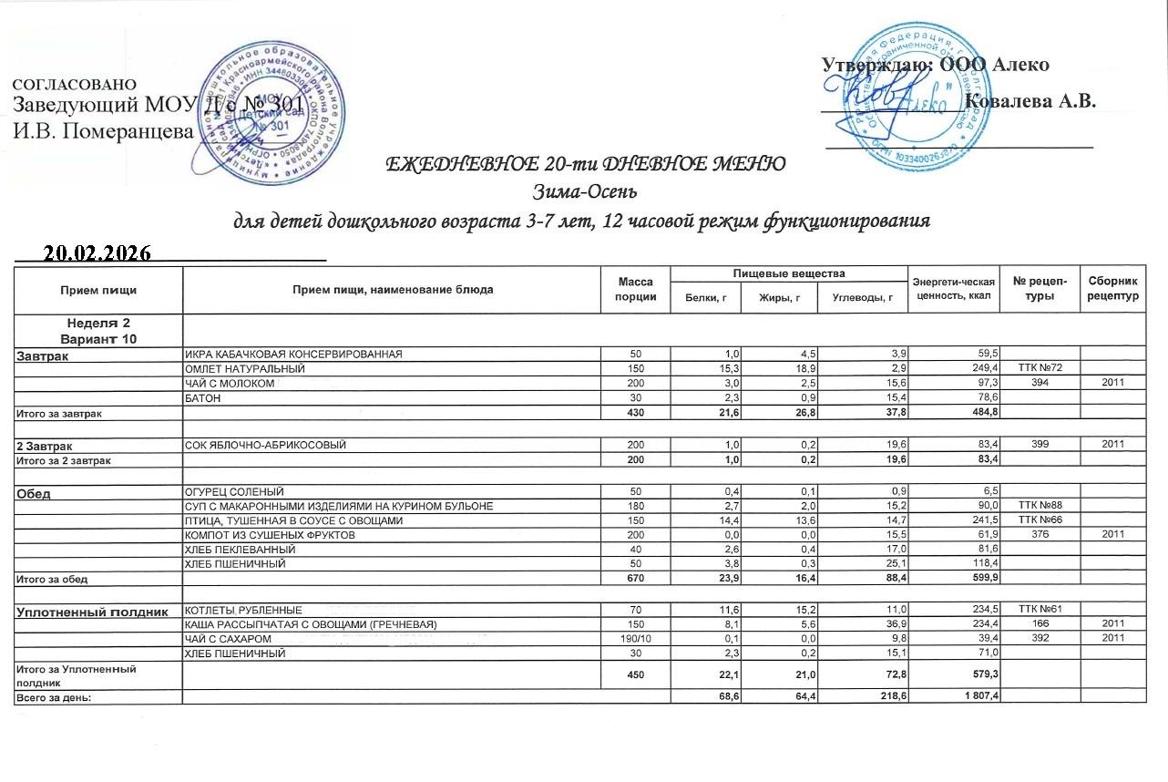 Меню для детей раннего возраста 1-3 лет и для детей дошкольного возраста 3-7 лет на 20.02.2026
