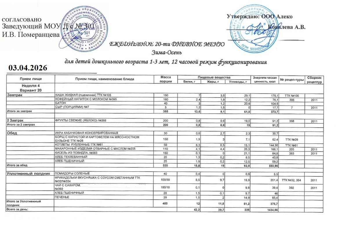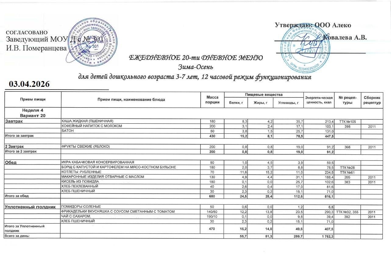 Меню для детей раннего возраста 1-3 лет и для детей дошкольного возраста 3-7 лет