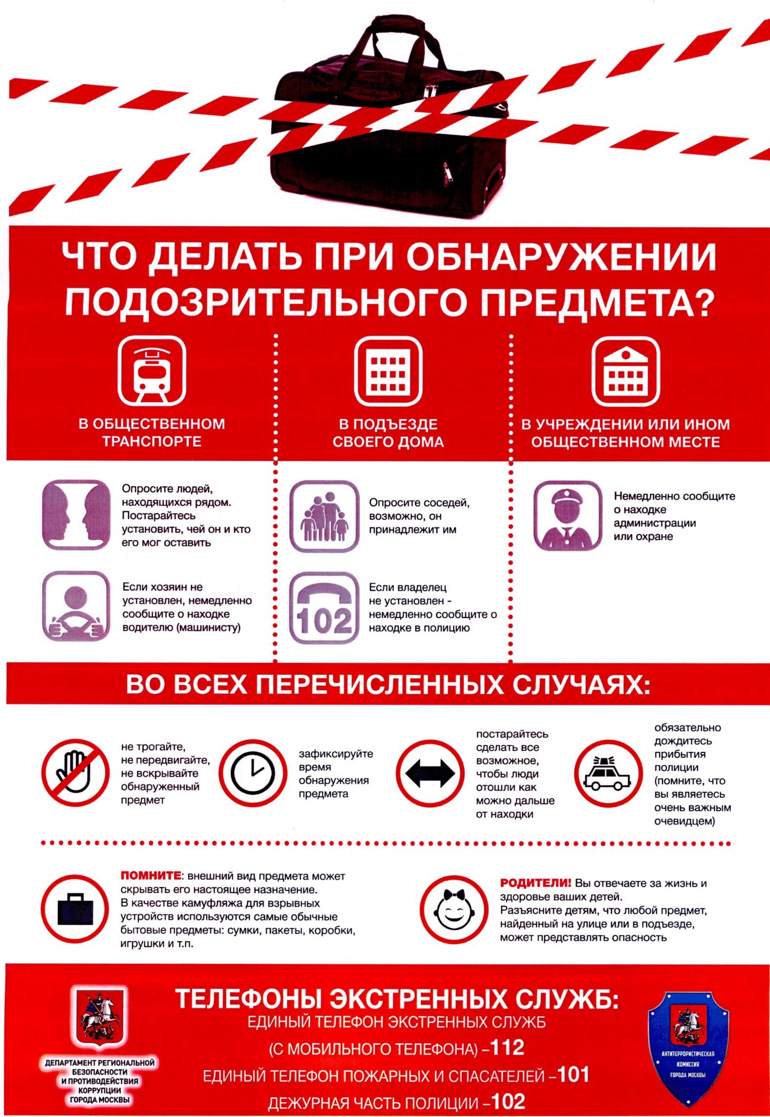 ПАМЯТКИ ПО ОБЕСПЕЧЕНИЮ БЕЗОПАСНОСТИ ЛЮДЕЙ ПРИ ОБНАРУЖЕНИИ БЕСХОЗНОГО ПРЕДМЕТА